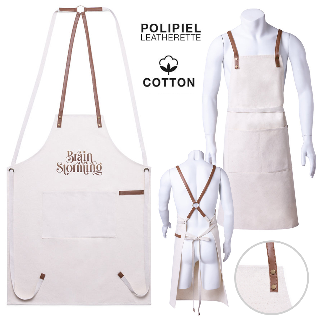 Delantal de alta calidad en resistente material 100% algodón canvas de 340g/m2, con costuras reforzadas. De corte por debajo de la rodilla, con cintas en resistente polipiel y triple ajuste: cuello, espalda y cintura. Con bolsillo frontal, accesorio en polipiel y remaches metálicos de refuerzo.