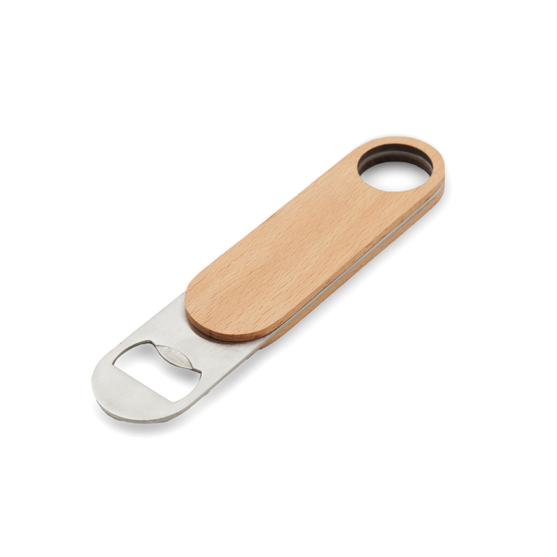 Abrebotellas fabricado en madera de haya y acero inoxidable 420SS. El producto viene en una bolsa de PLA 100% compostable. Dimensiones: 17,8 x 4 cm. Reuseme.