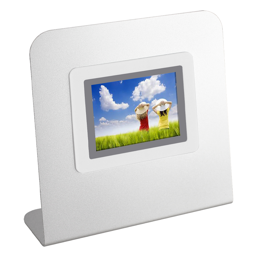 Estación Digital Porta-Fotos con marco metálico autosustentable, pantalla LCD 2.4" desmontable. Multi-idioma con Reloj, Alarma y Calendario. Memoria interna de 8MB. Incluye batería de litio de 3.7V-180MAH y fuente USB 5V.