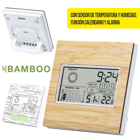 Estación meteorológica de línea nature con frontal en bambú. Con sensor de temperatura y humedad. Función calendario y alarma. Soporte trasero abatible y ajustable, con posibilidad de instalación en la pared. Alimentación a pilas (2xAAA no incluidas) y presentado en atractiva caja de diseño eco. Disponible manual de instrucciones en español e inglés. 2 Pilas AAA No Incluidas