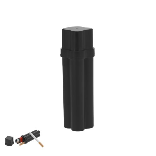Práctico estuche para tabaco de diseño compacto y longitud especial, ideal para transporte. Capacidad para dos cigarros y un mechero. Con tapadera con bisagra.