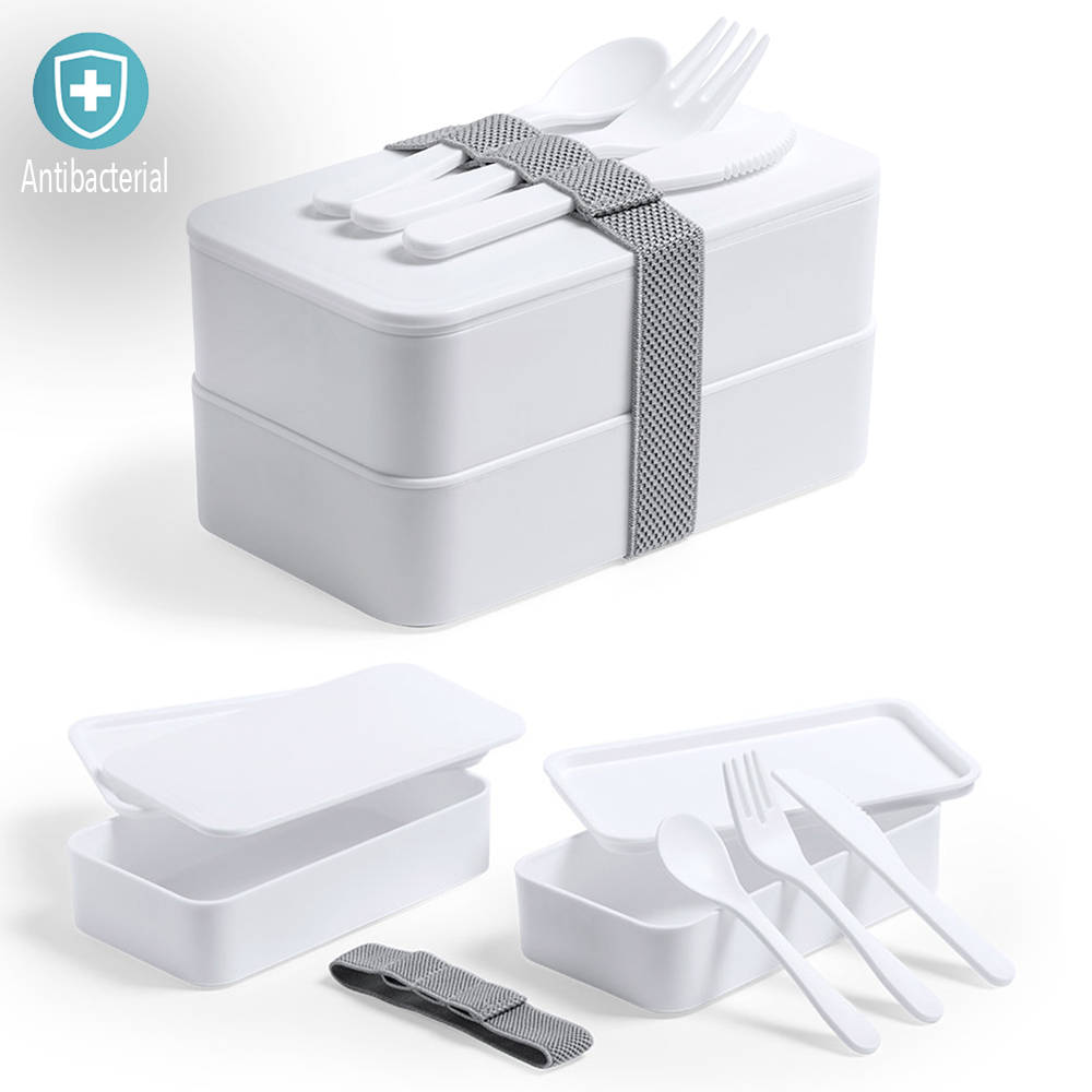 Fiambrera antibacteriana en resistente material PP de acabado sólido, libre de BPA. Dos compartimentos, cada uno de 700 ml de capacidad y cinta de seguridad con tenedor, cuchara y cuchillo. Los productos con tratamientos antibacterianos son capaces de reducir drásticamente las cargas bacterianas presentes en las superficies de los materiales, gracias a la incorporación de agentes microbianos permanentes estáticos, con alta efectividad para inhibir y prevenir la contaminación bacteriana. Artículo de acuerdo al estándar ISO 22196, que determina la actividad antibacteriana en materiales plásticos y superficies no porosas, lo que permite conocer la efectividad de inhibición microbiana que tienen los aditivos sobre los objetos tratados mediante una evaluación cuantitativa. 2 Compartimentos 700 ml