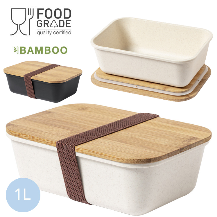 Fiambrera de 1l en resistente material PP veteado libre de BPA, con tapa de bambú. Cinta elástica de seguridad en tapa y certificación Food Grade, garantizando la seguridad cuando los alimentos entran en contacto con el material usado para fabricar el producto. 1 L
