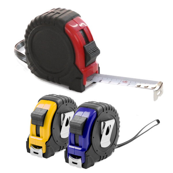 Flexómetro de 5 metros con cuchilla metálica y mecanismo de bloqueo. Con cuerpo de suave acabado en variados colores, recubierto con funda protectora de resistente goma, clip metálico para cinturón y cinta de transporte. Con troquelado especial para marcaje en doming/gota de resina y presentado en caja individual. Con Freno y Clip Incluido