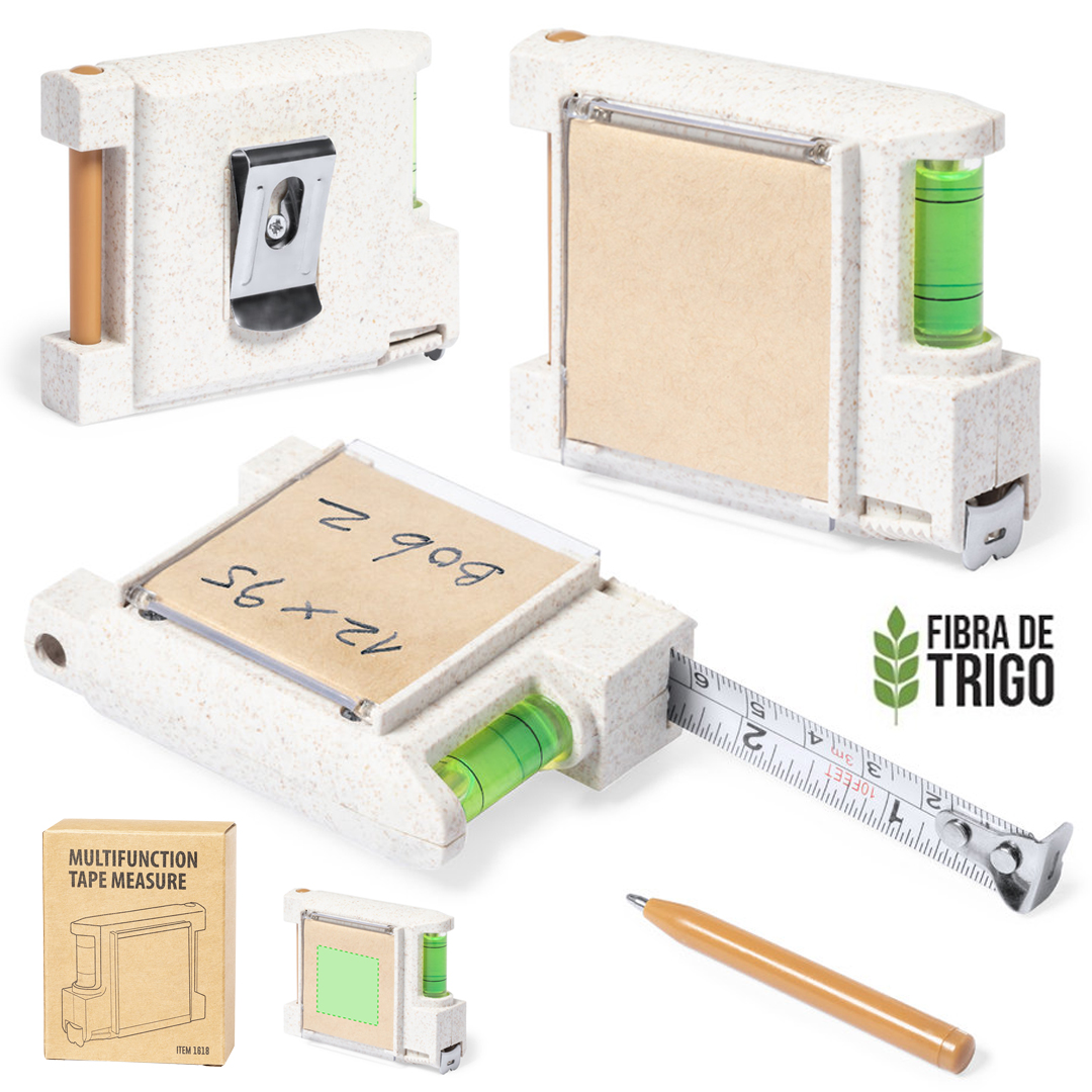 Flexómetro 3 m multifunción de línea nature, con carcasa fabrcada en caña de trigo. Con nivel integrado, soporte para bolígrafo (bolígrafo incluido) y bloc con 12 notas adhesivas en color natural. Con freno, clip metálico para cinturón y hoja con medidas en centímetros y pulgadas. Presentación en caja individual de diseño kraft.La caña de trigo fomenta la utilización de materias primas naturales, reduciendo así las emisiones contaminantes. 12 Notas Adhesivas 4,5 x 4,5 cm. Con Freno y Clip. Bolígrafo Incluido