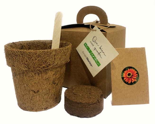 Comprimido de “Tierra Mágica”1 sobre con semillas (Mix de variedades: Girasol enano, caléndulas, zinnias)Instrucciones de siembraPaleta de madera para identificar las siembrasEtiqueta de cartulina Kraft o blanca impresa con diseño/logo entregado por el cliente (6 x 6 cm)Caja cartulina Kraft (11 x 11 x 11 cm)Amarre con cordel de yute