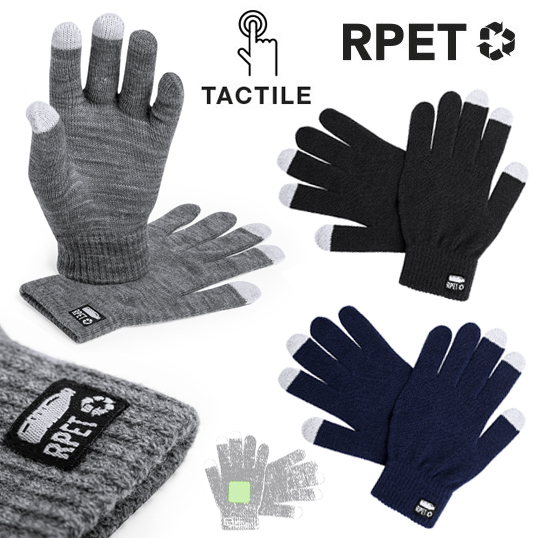 Práctico par de guantes de línea nature para dispositivos con pantalla táctil. De cálido y suave acabado poliéster RPET, elaborado a partir de plástico reciclado para así fomentar la reutilización de residuos plásticos y contribuir a la sostenibilidad del planeta. Función táctil en dedos corazón, índice y pulgar. Talla única adulto, con distintivo RPET en etiqueta exterior. Talla Única. Adulto