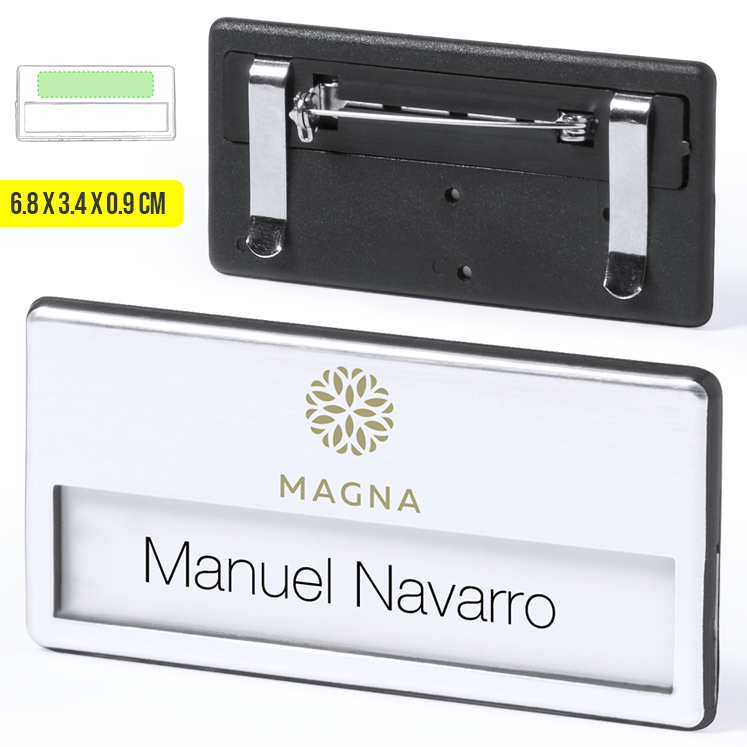 Identificador en acabado brillante. Parte trasera con doble sistema de fijación -pinzas de enganche metálicas e imperdible- para un ajuste seguro.