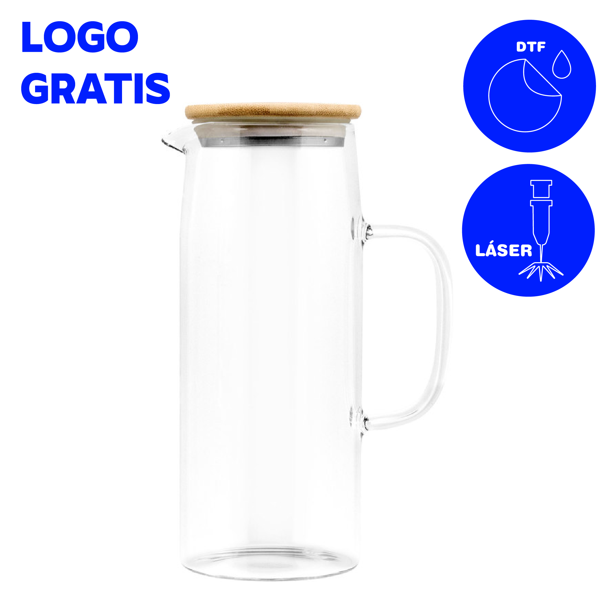 Ø 8,8 x 22,8 cm. Capacidad 1100 ml. Vidrio de borosilicato y bambú. Jarra con pico vertedor y asa de vidrio de borosilicato. Tapa de bambú y acero inoxidable 304 con anillo de silicona antiderrame. Presentación en caja de regalo kraft.