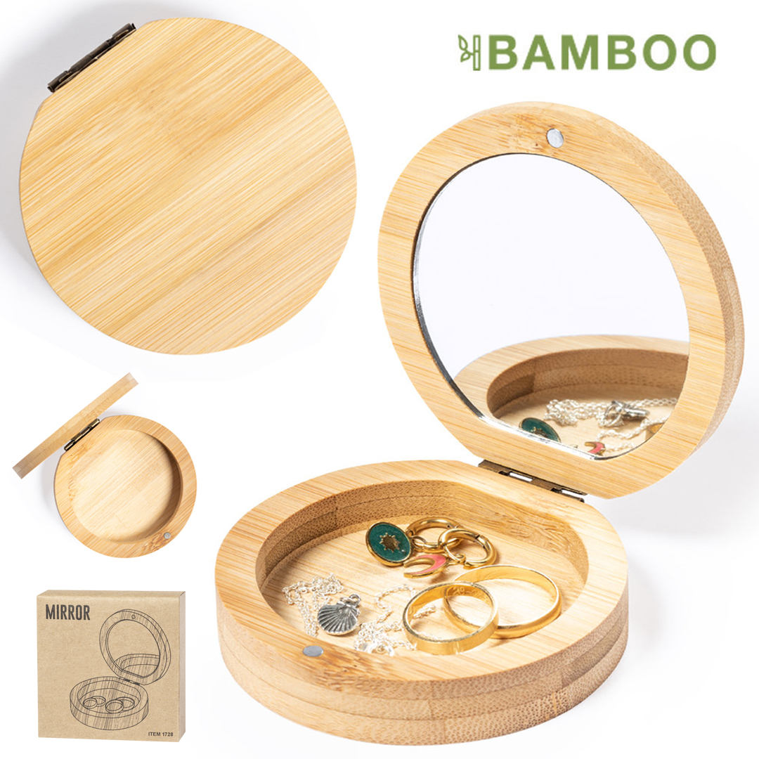 Joyero de línea nature, con carcasa fabricada en bambú. Con espejo interior 1X y cierre magnético. Presentado en caja individual de diseño kraft.
