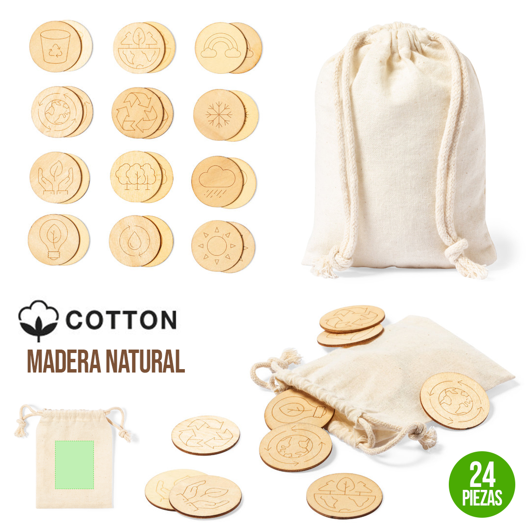Juego de concienciación ecológica fabricado en madera. Set de 24 piezas en bolsa de transporte 100% algodón con cordones de cierre a juego. 24 Piezas. Funda Algodón