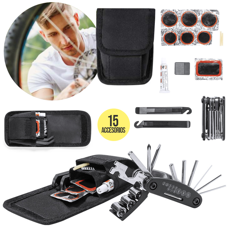 Completo kit de reparación para bici de 14 accesorios. Presentado en resistente estuche de poliéster 600D, con cierre de velcro. Incluye desmontadores de cubierta, multiherramienta y kit de reparación de pinchazos. 15 Accesorios