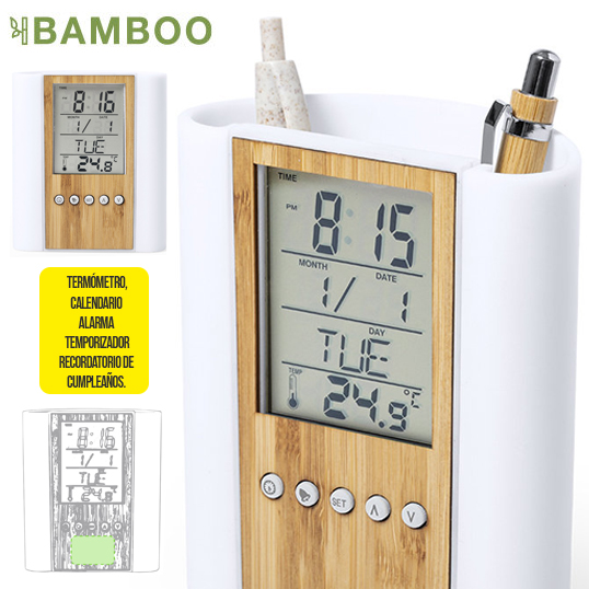 Lapicero de línea nature con reloj multifunción integrado. Fabricado en combinación de materiales bambú y ABS. Funciones termómetro, calendario y alarma temporizador y recordatorio de cumpleaños. Alimentación a pilas (de botón incluidas) y presentado en atractiva caja de diseño eco. Disponible manual de instrucciones en español e inglés. Pila Botón Incluida