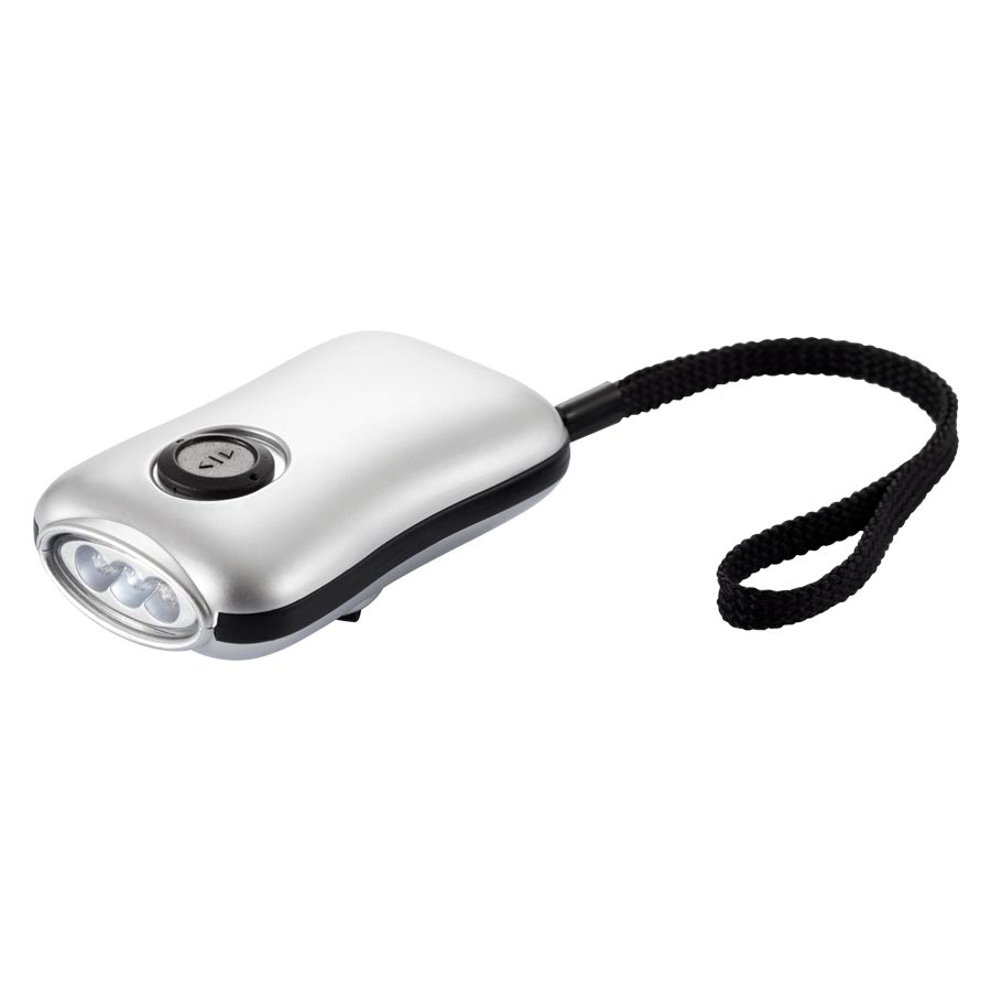 Linterna 3 LED con dínamo de manivela. Con huincha para colgar.