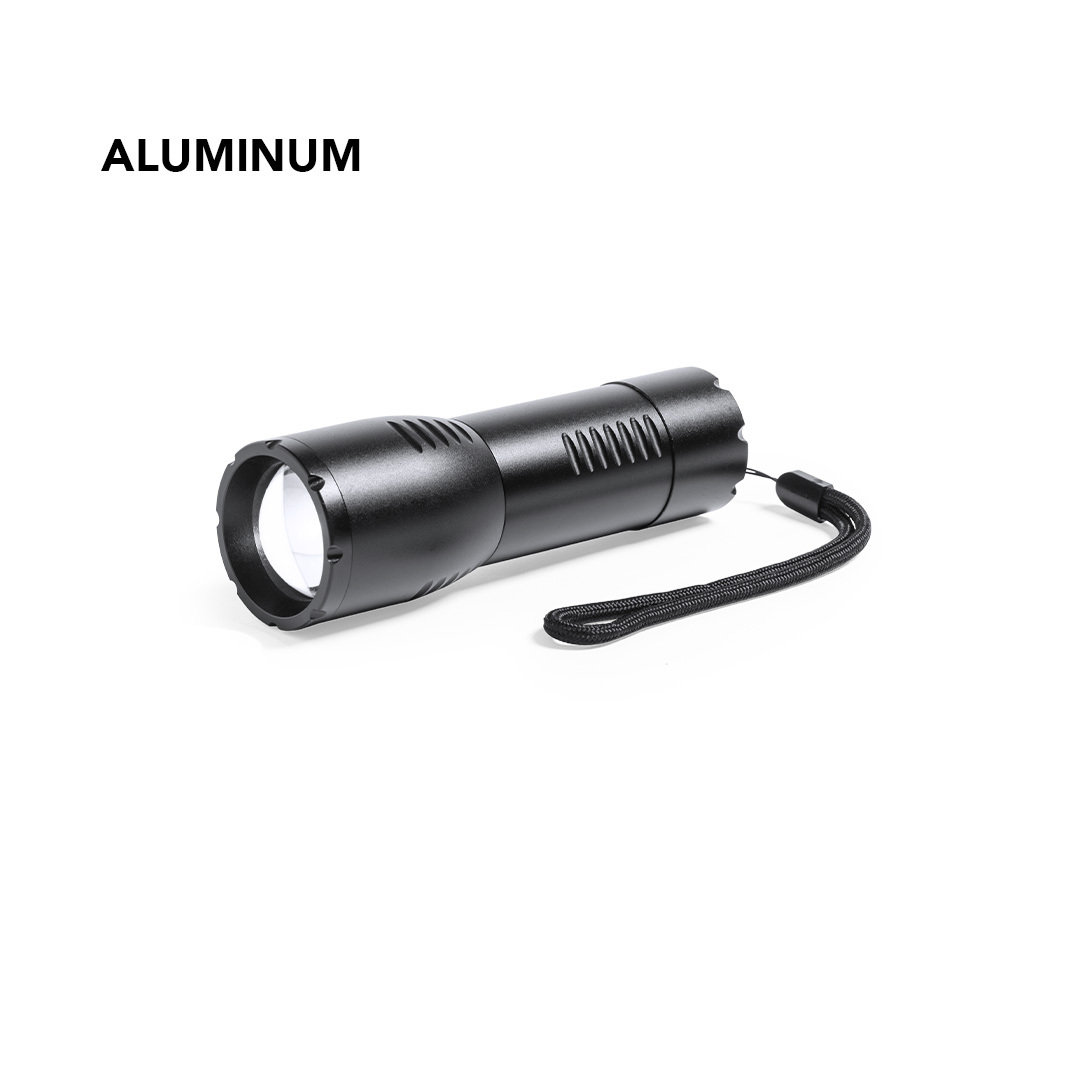 Linterna de alto poder de iluminación fabricada en aluminio de color negro y acabado mate. Con 200 lúmenes, función zoom y 3 posiciones de iluminación (fija e intermintente). Pulsador protegido con recubrimiento en resistente goma y cinta de transporte a juego. Presentada en caja individual negra de diseño. Alimentación a pilas (3xAA no incluidas). 1 Led. 200 Lúmenes. Zoom. 3 Posiciones de Luz, Fija e Intermitente. 3 Pilas AA No Incluidas
