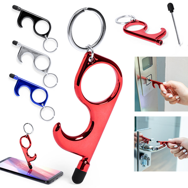 Llavero higiénico anti-contacto con bolígrafo y puntero integrados. Fabricado en resistente ABS de acabado metalizado y disponible en variada gama de colores. Especialmente diseñado para evitar tocar con las manos superficies de uso común (manivelas de puertas, interruptores, grifos de uso público, cajeros automáticos...). Con cómodo troquel para el dedo y presentado en bolsa individual de diseño. Recomendado para marcaje en tampografía. Bolígrafo Puntero Incluido