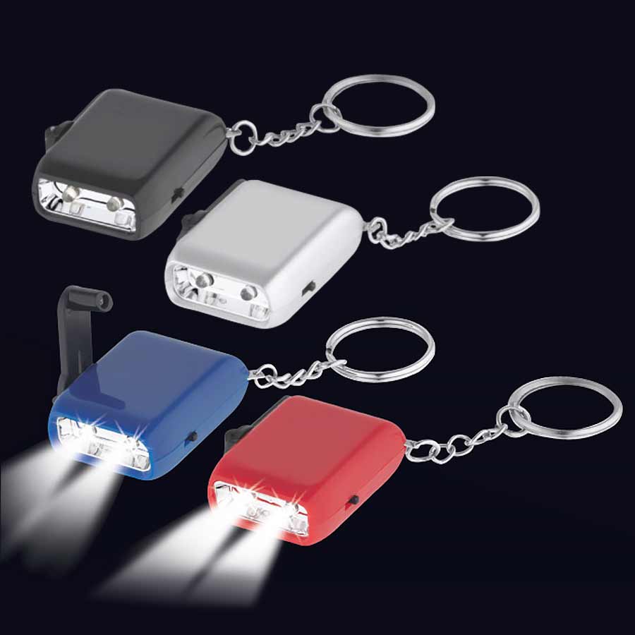 Llavero-Linterna 2-LED con Dínamo. Recargable por fricción mediante giro de la manivela.
