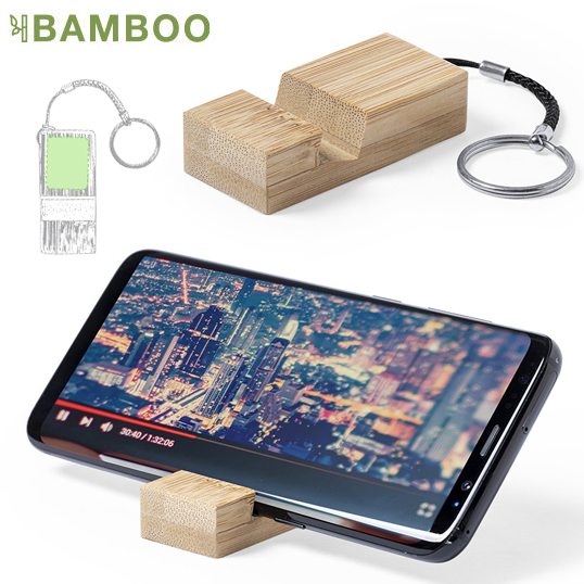 Llavero soporte de línea nature para smartphone. Fabricado en resistente bambú de acabado lacado, con resistente cordón y anilla metálica.