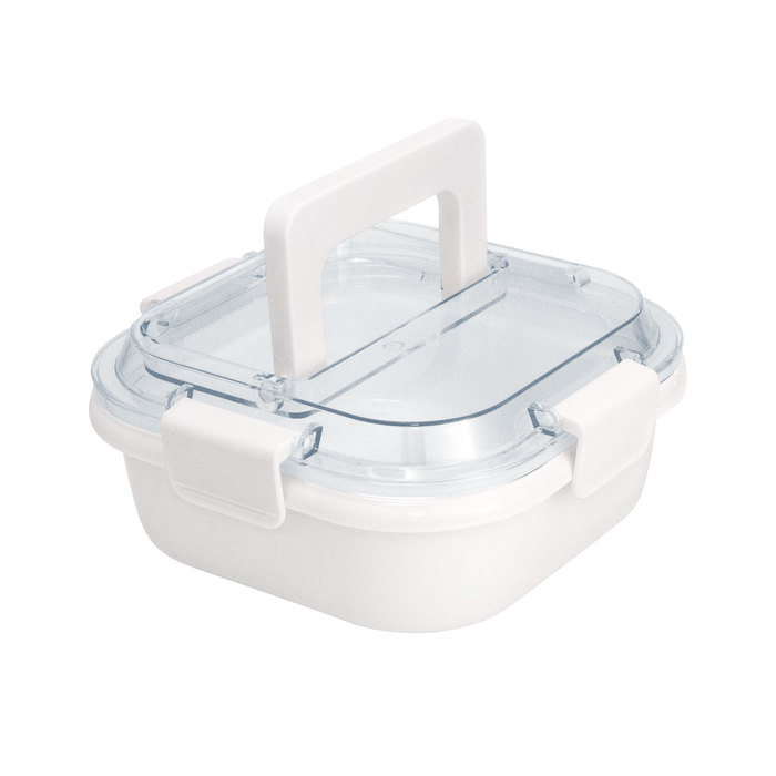 17,8 x 17,8 x 7,6 cm. Capacidad 1 litro. Plástico PP. Contenedor de alimentos. Tapa translúcida con cuatro clips de cierre hermético y asa para trasladar cómodamente. Clips y asa del mismo color que el recipiente.