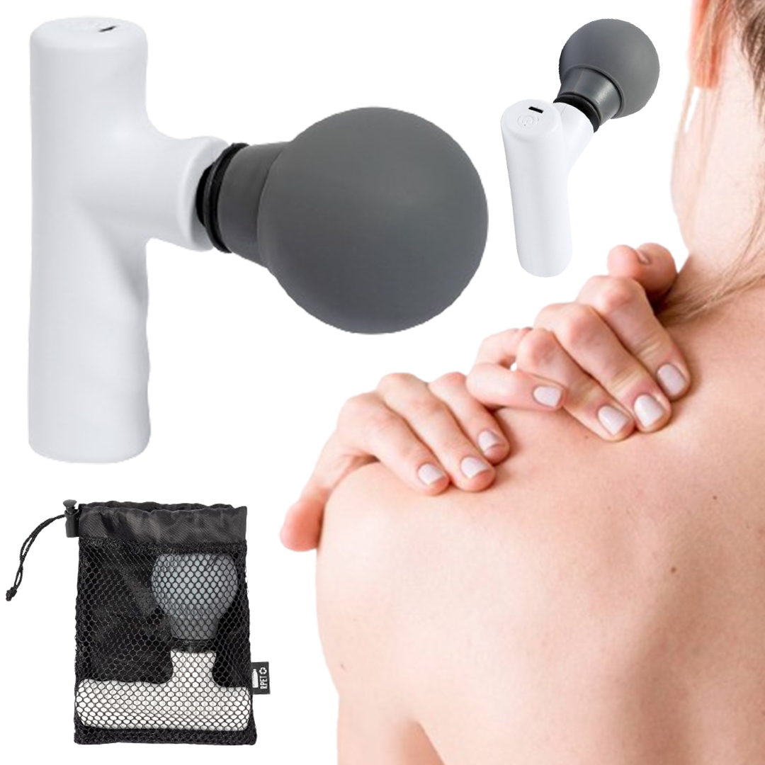 Masajeador eléctrico. Ayuda a relajar los músculos, aliviar los efectos del entrenamiento, liberar tensión y revitalizar el cuerpo. Con dos posiciones de intensidad. Batería recargable de larga duración de 800 mAh - cable USB incluido-. Con manual de uso en español e inglés. Presentado en funda de poliéster RPET con cierre de cordón, elaborada a partir de plástico reciclado para así fomentar la reutilización de residuos plásticos y contribuir a la sostenibilidad del planeta. Etiqueta distintiva RPET en la funda. 2 Posiciones. Batería 800 mAh. Funda Poliéster RPET