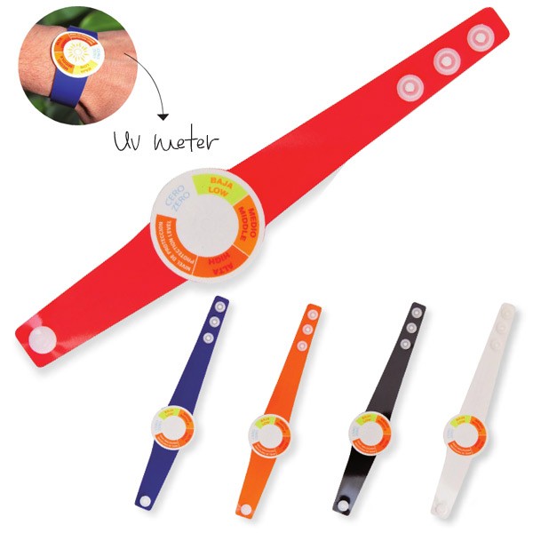 Pulsera ajustable con medidor de radiación UV en variada gama de vivos colores. Con cierre de corchete.