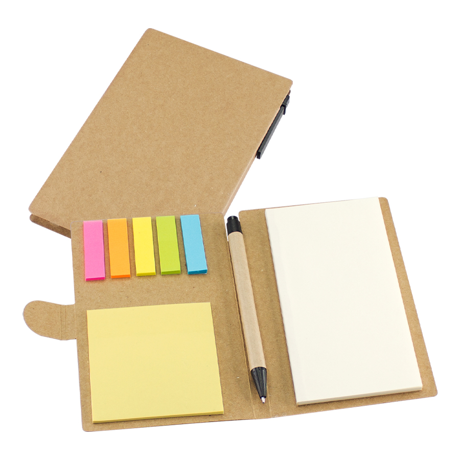 Memo set Ecológico Grande de Cartón natural. Incluye Bolígrafo Ecológico, 50 notas adhesivas amarillas claras grandes de 14.4 x 7.5 cm, 25 notas adhesivas amarillas medianas de 7.7 x 7.7 cm y 125 banderitas adhesivas de colores de 4.5 x 1.3 cm.