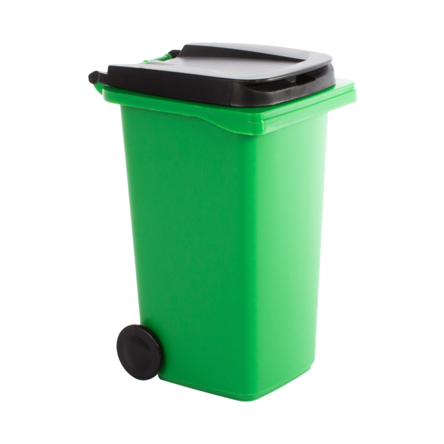 Mini Basurero Verde de Sobremesa plástico verde, con tapa y ruedas negras.