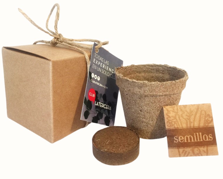 1 macetero de turba vegetal biodegradable (100 cc.) (6 x 6 x 4 cm)Comprimido de “Tierra Mágica”1 sobre con semillas (Variedades según temporada) Hierbas Aromáticas/Huerto/FloresInstrucciones de siembraCaja cartulina Kraft (7 x 7 x 7 cm)Etiqueta de cartulina Kraft o blanca impresa color con personalizado (6 x 6 cm)Amarre con cordel de yute