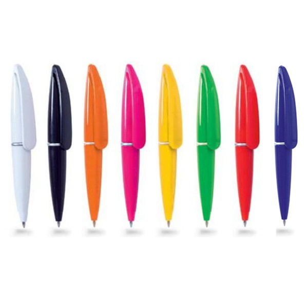 Mini bolígrafo de mecanismo giratorio en llamativos colores sólidos. Con original clip de gran tamaño y anilla central en color plateado. Tinta azul.