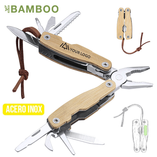 Multiherramienta con resistente cuerpo en acero inox y empuñadura de bambú, con 12 funciones. Incluye cuchillos y navajas destornilladores, limas abridores y alicates. Con cinta para transporte en polipiel y presentada en caja individual. 12 Funciones