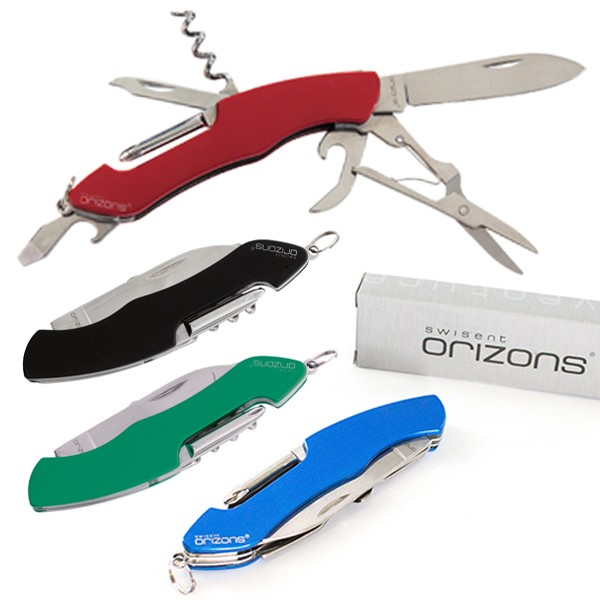 Navaja multiusos de orizons con accesorios de acero inox de 10 funciones y mango de aluminio en vivos colores. Con navaja, tijeras, abrelatas, abrebotellas con destornillador plano, destornillador de punta de estrella, punzón con lima y sacacorchos. Con anilla para llavero y presentada en atractiva caja de diseño con logotipo de la marca. 10 Funciones