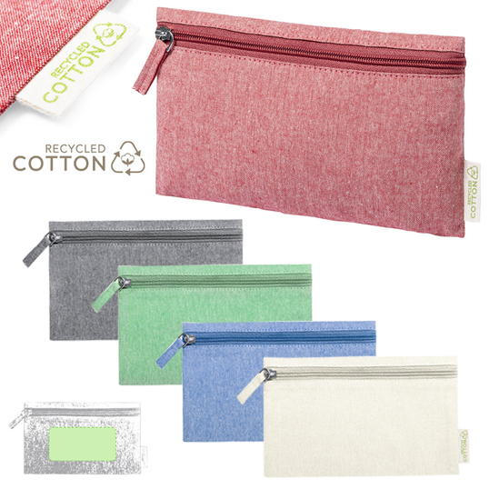 Estuche de línea nature elaborado en algodón reciclado. Compartimento principal de cierre de cremallera y tirador juego, con distintivo algodón reciclado en etiqueta.
