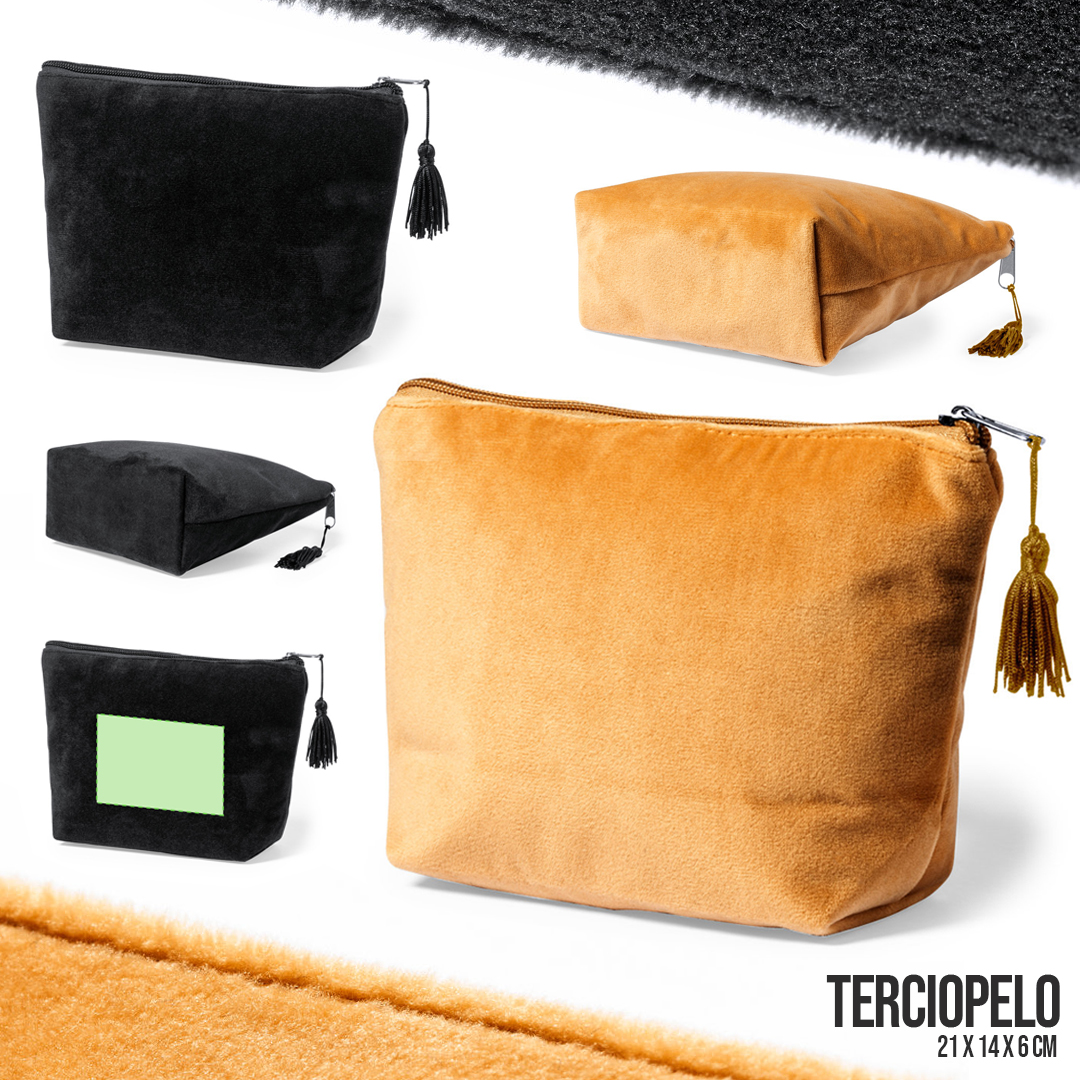 Neceser de tacto terciopelo, con cierre de cremallera y borla en tirador. Fabricado en terciopelo rayón y de acabado cosido, disponible en colores marrón y negro.