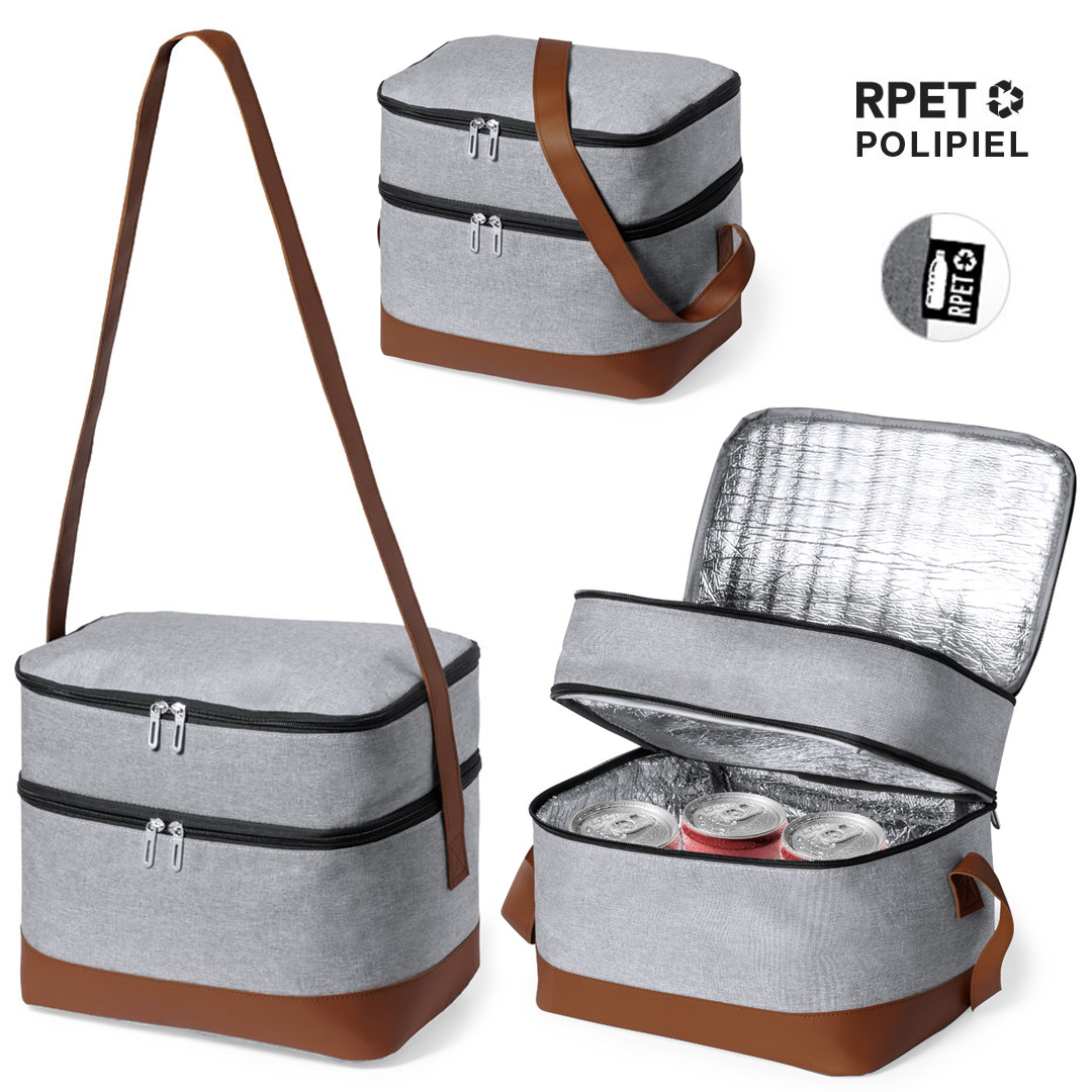 Nevera fabricada en resistente 600D RPET. Acabado en color gris, con base y cinta bandolera de transporte en polipiel marrón. Incluye 2 compartimentos independientes, con cierre de cremallera y tiradores metálicos. Interior isotermo en aluminio y etiqueta exterior con distintivo RPET.El material RPET se elabora a partir de plástico reciclado, para así fomentar la reutilización de residuos plásticos y ayudar a la sostenibilidad del planeta.