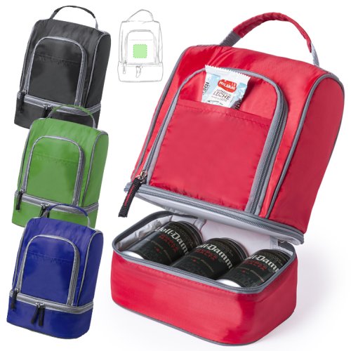 Nevera todoterreno en poliéster 210D de vivos colores y con dos compartimentos independientes con cierre de cremallera. Con bolsillo frontales, uno de ellos con cremallera, e interior isotermo en acabado PEVA. Práctica asa de transporte reforzada a juego.