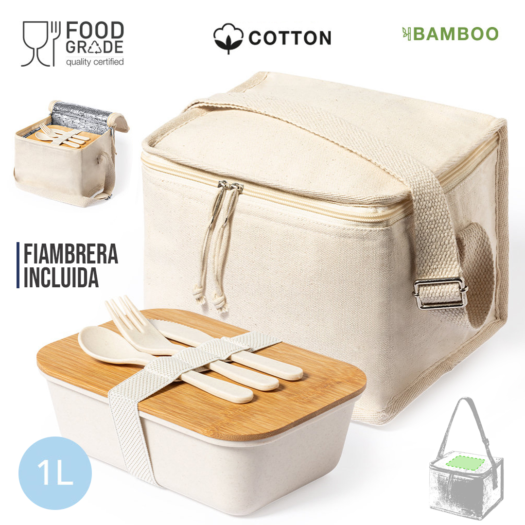 Set de fiambrera y nevera de línea nature con Certificación Food Grade, garantizando la seguridad cuando los alimentos entran en contacto con el material usado para fabricar el producto. Incluye:Nevera fabricada en material 100% algodón, con interior isotermo acabado en aluminio. Cierre de cremallera con doble tirador de cordón y asa de transporte a juego.Fiambrera fabricada en PP veteado libre de BPA, con tapa de bambú y 1l de capacidad. Cierre de cinta elástica de seguridad, con compartimentos para tenedor, cuchara y cuchillo (incluidos). Fiambrera PP/ Bambú 1 L Incluida