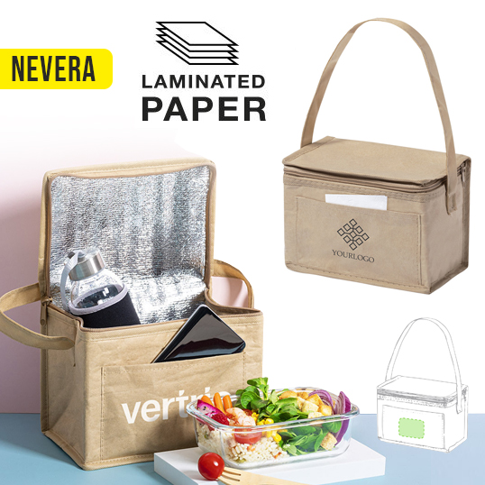 Nevera de línea nature con capacidad para 6 latas. Fabricada en papel laminado resistente a la humedad, con interior isotermo acabado en aluminio. Cremallera y asa de transporte a juego, con bolsillo exterior para marcaje.
