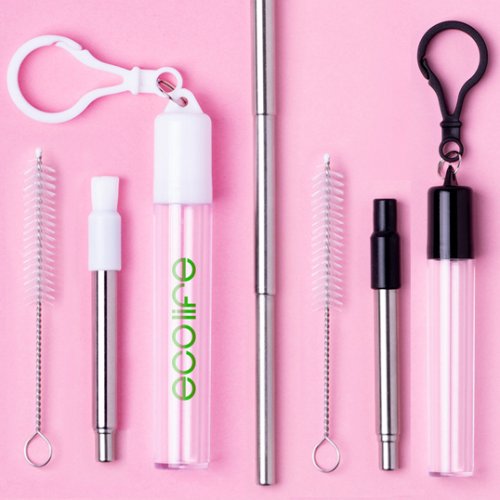 Pajita reutilizable y extensible en acero inoxidable, con boquilla de silicona. Con accesorio limpiador incluido y presentada en estuche transparente con accesorio para transporte. Extensible. Reutilizable. Limpiador Incluido