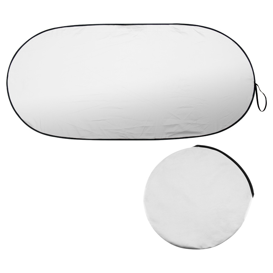 Parasol plegable de nylon plateado para el vehículo. Presentación dentro de funda redonda de nylon plateado. Gran área para impresión.