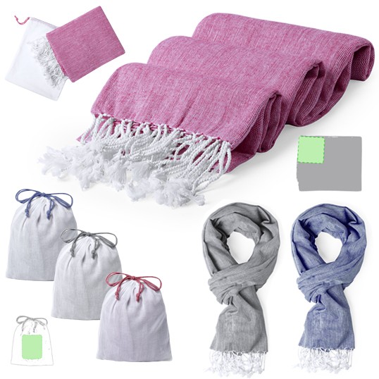 Pareo toalla 2 en 1 en algodón de 110g/m2 y en variados colores. Presentado en bolsa individual de algodón con cordón a juego. Funda Algodón