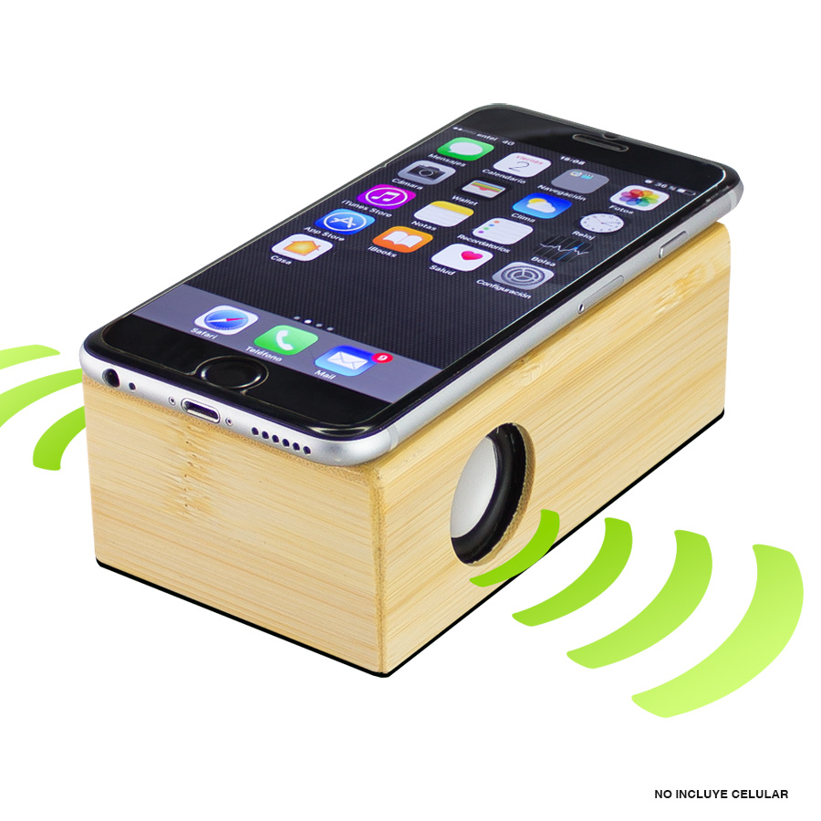 Parlante amplificador de sonido por Inducción, de madera de Bamboo. No necesita Bluetooth, Wi-Fi o conexión a cable. Amplifica el sonido una vez que se posa el celular sobre él, con un efecto de caja de resonancia. Compatible con cualquier modelo de teléfono celular. Contiene batería de ion-litio recargable incorporada. Incluye cable de sonido y cargador USB.