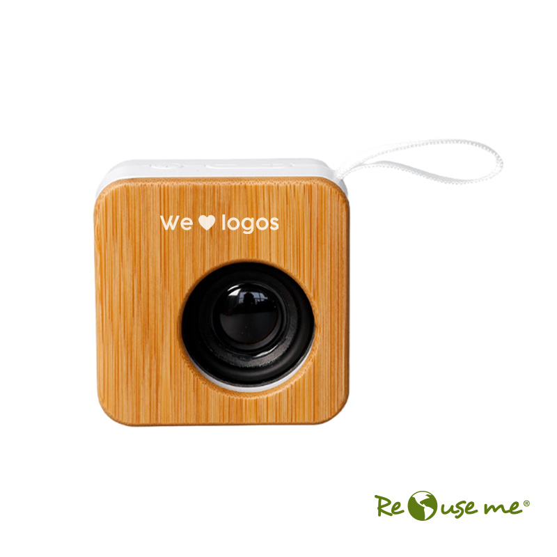 Parlante portátil fabricado en ABS reciclado (rABS) y bambú. Tiene tecnología Bluetooth 5.0 y una batería de500 mAh que ofrece de 3 a 4 horas de reproducción. El parlante cuenta con ranura de tarjeta Micro SD. El parlante cuenta con un botón que permite encender y apagar el dispositivo, pausar y reproducir canciones, contestar y colgar llamados, cambiar a modo radio FM. El parlante cuenta con una función que permite unir dos parlantes en simultaneo para contar con reproducción estéreo. El parlante viene dentro de una caja de cartón junto a su manual de instrucciones y cable cargador. Dimensiones: 7 x 7 x 3,7 cm. Reuseme. Incluye Gift Box confeccionada en cartulina Kraft.