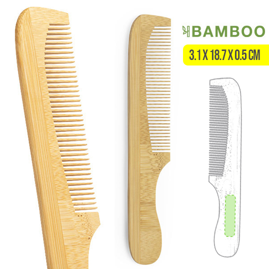 Peine de línea nature en bambú pulido, con amplia superficie de marcaje en mango.