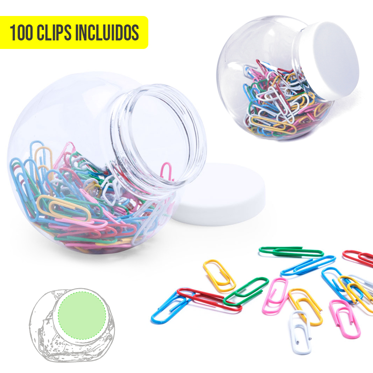 Original bote porta clips de cuerpo transparente y tapa blanca a rosca con superficie lisa para marcaje. Con 100 clips multicolor recubiertos en PVC incluidos. 100 Clips Incluidos