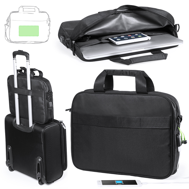 Portadocumentos en resistente poliéster 600D de acabado en color negro y de cierre de cremallera. Con salida para auriculares y compartimento interior con salida USB para conexión de powerbank -no incluido-. Con resistentes asas reforzadas y accesorio en la parte posterior para acople en barra de trolley. Interior con compartimento acolchado para ordenador portátil de hasta 15 pulgadas y compartimento para tablet de hasta 10 pulgadas. Con Multitud de bolsillos interiores y exteriores y cinta bandolera ajustable con cierre de mosquetón. Conexión USB. Bolsillo Acolchado para Portátil y Tablet