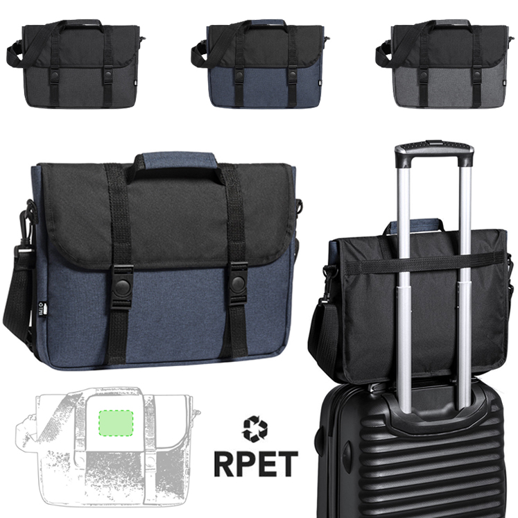 Portadocumentos de línea nature y en resistente poliéster 600D RPET reciclado y libre de PVC, fruto de la combinación del proceso de reciclaje de materiales plásticos junto con la técnica milenaria de fabricación del fieltro, dando como resultado un material de eco-tendencia de origen reciclado. Con acolchado y bolsillo principal con tiras de cierre de hebilla bolsillo interior de cierre de cremallera y cinta bandolera ajustable para hombro. Con asa de transporte reforzada y accesorio en parte posterior para ajuste en barra de trollley. Resistencia hasta 7kg, con distintivo RPET en etiqueta exterior. Acolchado