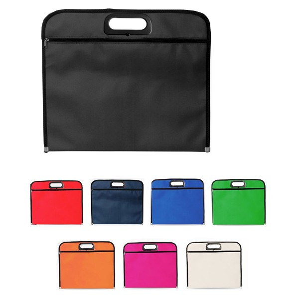 Portadocumentos de cierre de cremallera en suave acabado de poliéster 600D de vivos colores. Con asas de transporte de original diseño troquelado con refuerzo y ribetes en color negro con chapa metálica de refuerzo en la base.
