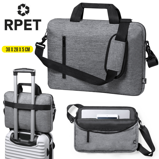 Elegante portadocumentos de línea nature en resistente 600D RPET efecto melange, elaborado a partir de plástico reciclado para así fomentar la reutilización de residuos plásticos y contribuir a la sostenibilidad del planeta. Detalles en negro, incluye compartimentos interiores acolchados para ordenador de hasta 15 pulgadas y tablet de hasta 10 pulgadas. Accesorio en parte posterior para anclaje al trolley, bolsillo exterior con cierre de cremallera, cómodas asas reforzadas, cinta bandolera ajustable con cierre de mosquetón y almohadilla para hombro a juego. Distintivo RPET en etiqueta exterior. Bolsillo Acolchado para Portátil y Tablet