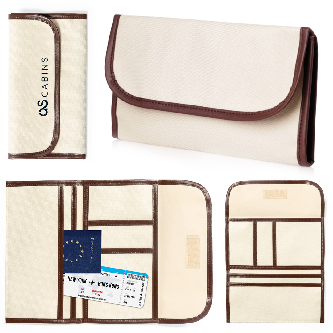 Portadocumentos de viaje fabricado en resistente 600D de acabado natural, con ribetes y refuerzos en polipiel marrón. Solapa con cierre de velcro y multitud de compartimentos interiores.