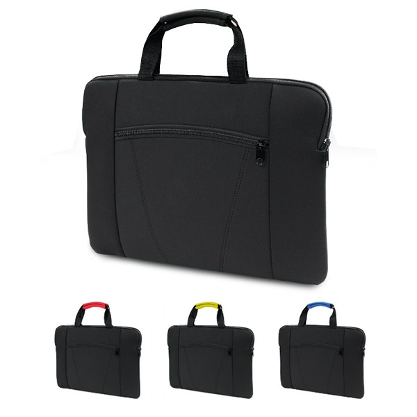 Resistente portadocumentos de soft shell con cierre de cremallera y bolsillo frontal. En elegante acabado de color negro y refuerzos en color en las asas.